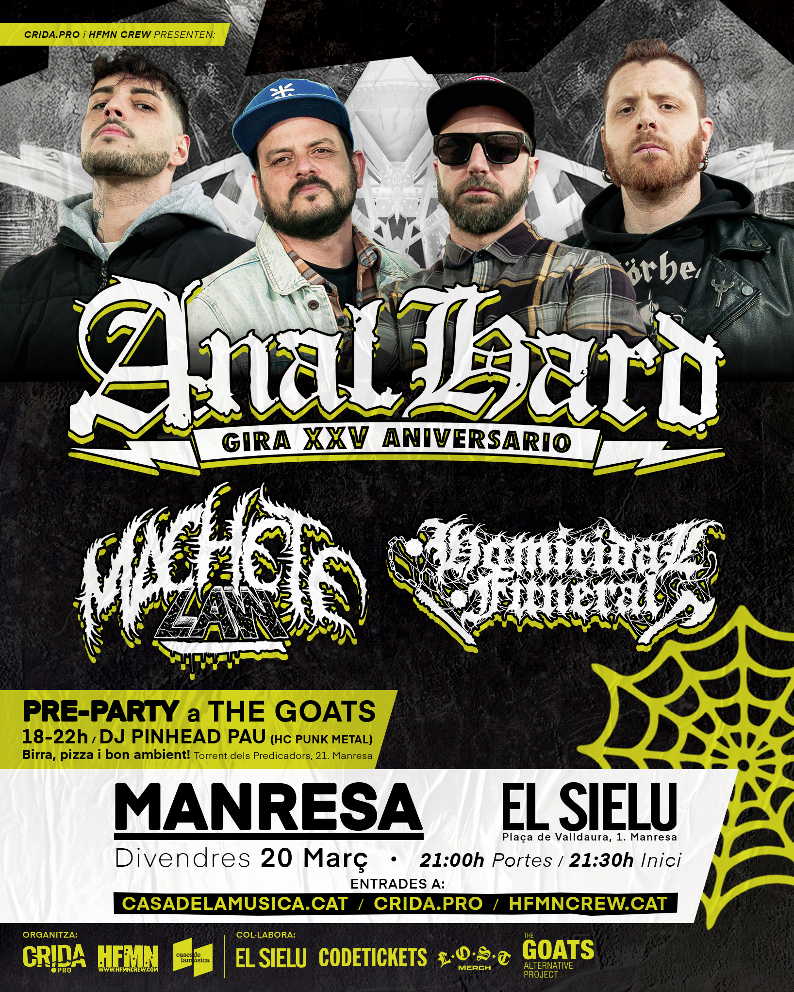Direcció: Plaça de Valldaura, 1. ManresaHoraris: 21:00h Portes / 21:30h Homicidal Funeral / 22:30h Machete Law / 23:30h Anal Hard